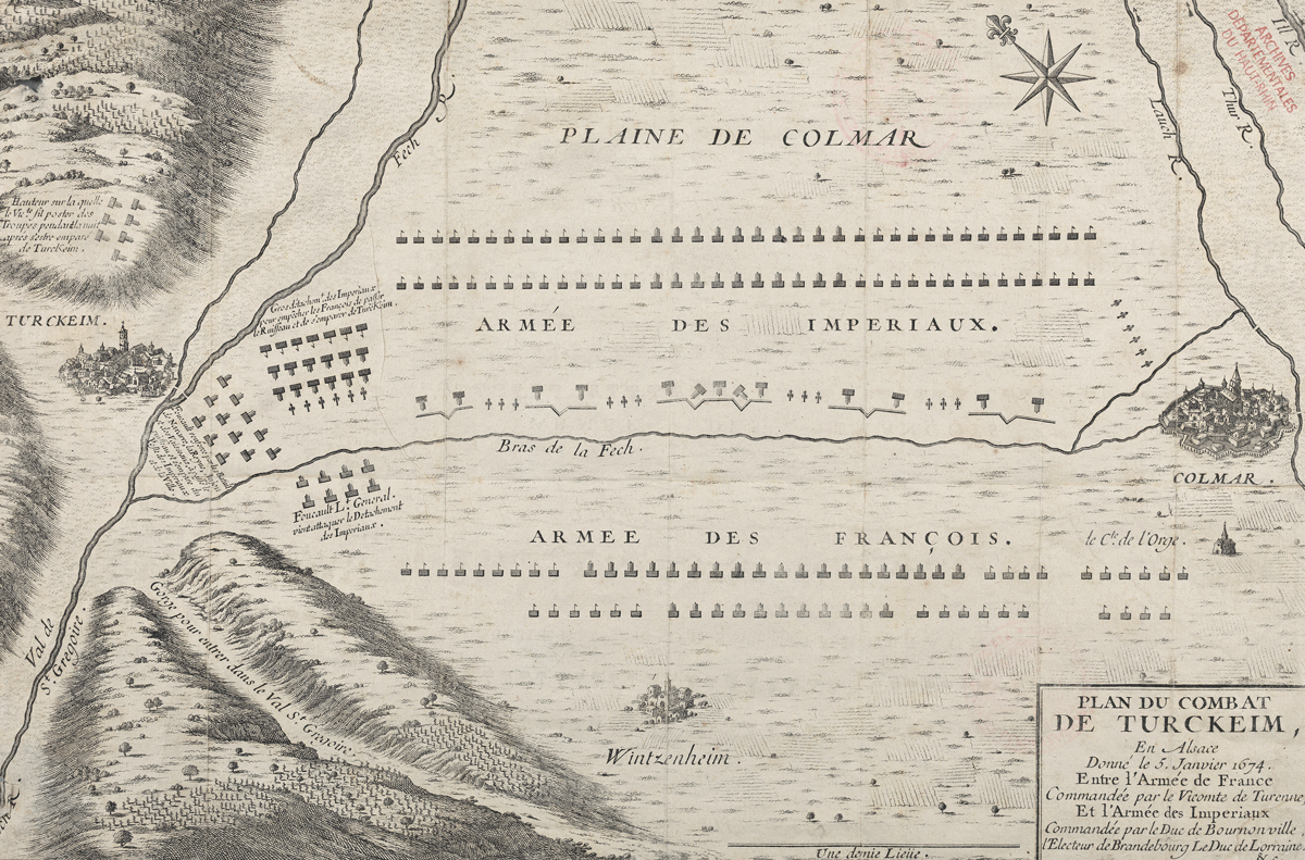 Plan du combat de Turckheim, en Alsace, par Antoine Coquart, XVIIe siècle, Archives d’Alsace, site de Colmar. © Archives d’Alsace, site de Colmar / ESTAMPE/119 © Collectivité européenne d’Alsace, tous droits réservés