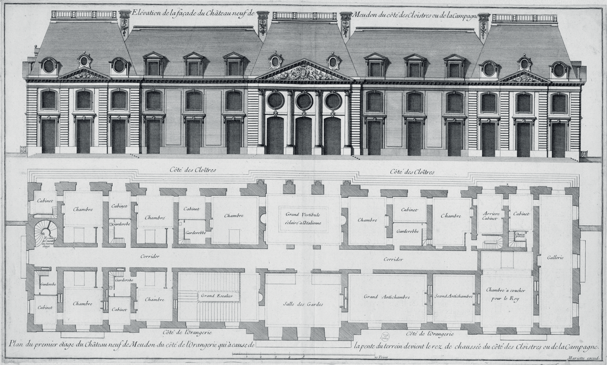 Château-Neuf de Meudon, façade et plan du 1er étage, par Jean Mariette, XVIIIe siècle, musée du Domaine départemental de Sceaux.