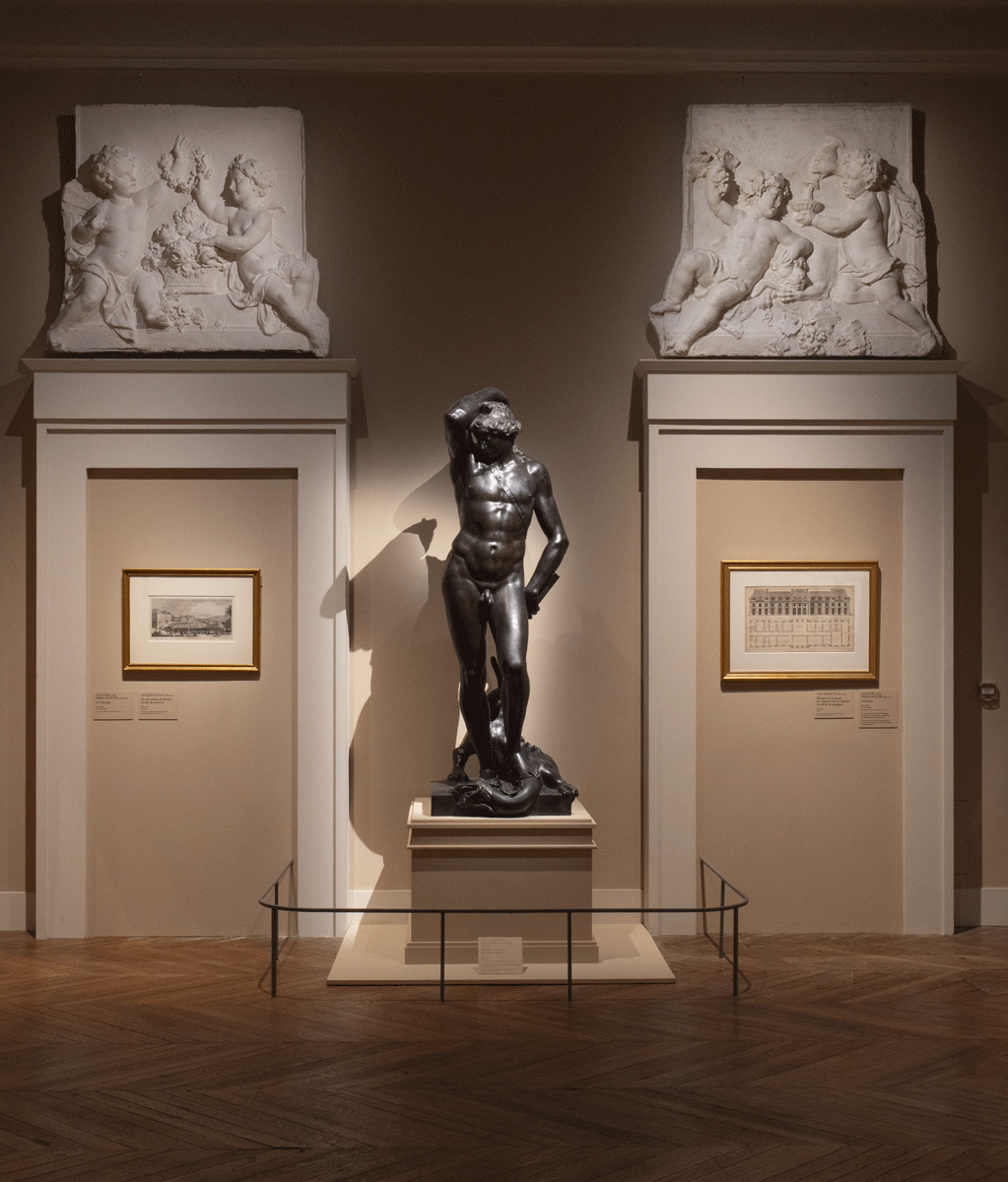 En haut, Le Printemps et L’Automne, d’après Pierre Lepautre, bas-reliefs en plâtre réalisés avant 1871, Paris, musée Carnavalet. Au centre, Apollon vainqueur du serpent Python, attribué à Giovan Francesco Rustici, 1535-1545, Paris, musée du Louvre. © EPV / Thomas Garnier.
