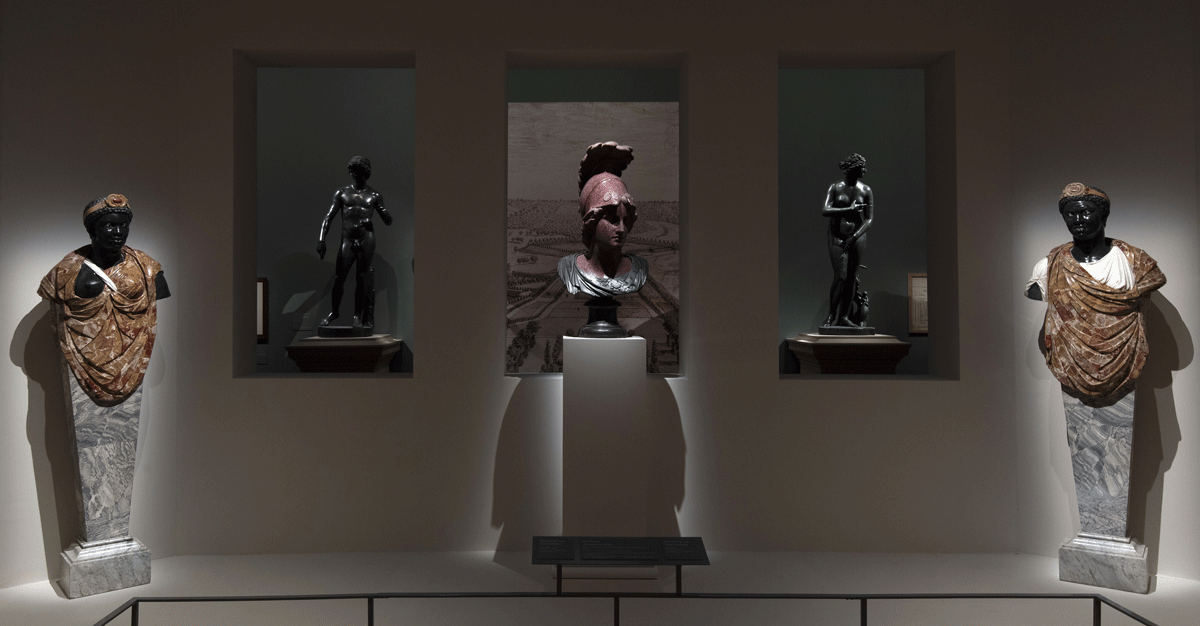 Des sculptures de la collection du Grand Dauphin au château de Meudon, présentées dans la troisième partie de l’exposition. Mauresse et Maure (musée national du château de Compiègne), paire de termes en marbres entourant le buste en porphyre et bronze d’Alexandre le Grand (musée du Louvre), tous datant du XVIIe siècle. En arrière plan, les statues de bronze de Adonis, dit aussi Jeune homme, Jeune berger ou Jeune athlète et de Vénus Médicis, par Jean-Balthazar Keller, 1685-1687, musée national des châteaux de Versailles et de Trianon. © EPV / Didier Saulnier
