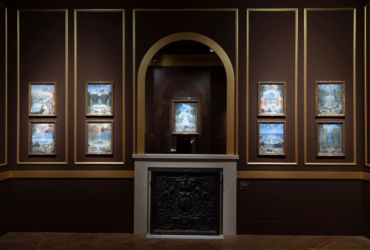 Série de gouaches des bosquets de Versailles par Jean Cotelle, inspirées des tableaux qu’il réalisa pour le Grand Trianon. Ces miniatures se trouvaient dans le Cabinet de l’appartement des Berceaux, au rez-de-chaussée de l’aile est du château de Meudon. © EPV / Didier Saulnier