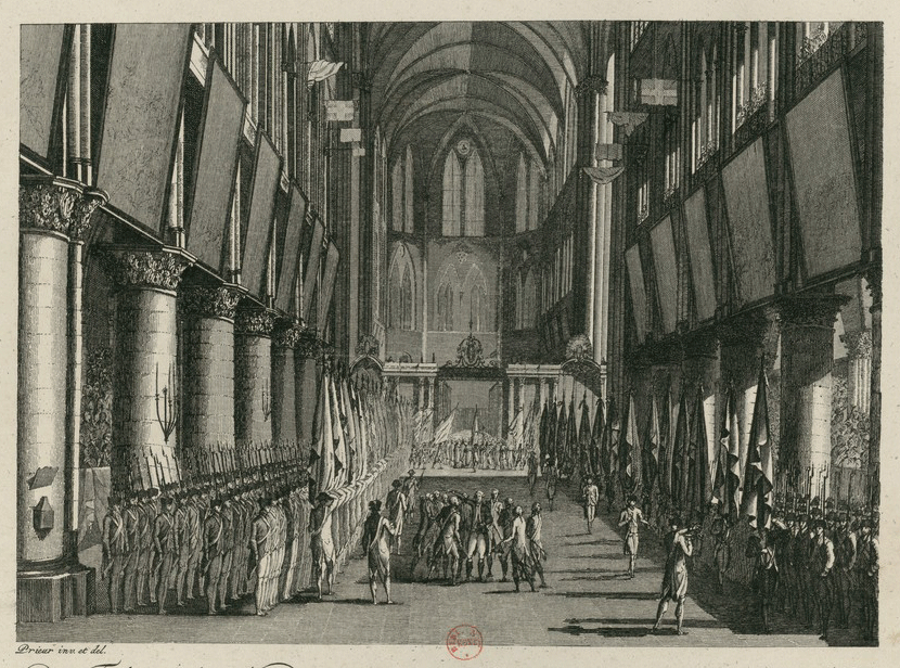Bénédiction des drapeaux de la garde nationale dans la cathédrale Notre-Dame, le 12 septembre 1789, par Jean-Louis Prieur (dessinateur), eau-forte extraite d’un recueil de gravures allemandes sur les événements de la Révolution française et éditée entre 1794 et 1820, Bibliothèque nationale de France. © Bibliothèque nationale de France (BnF) / Département Estampes et photographie