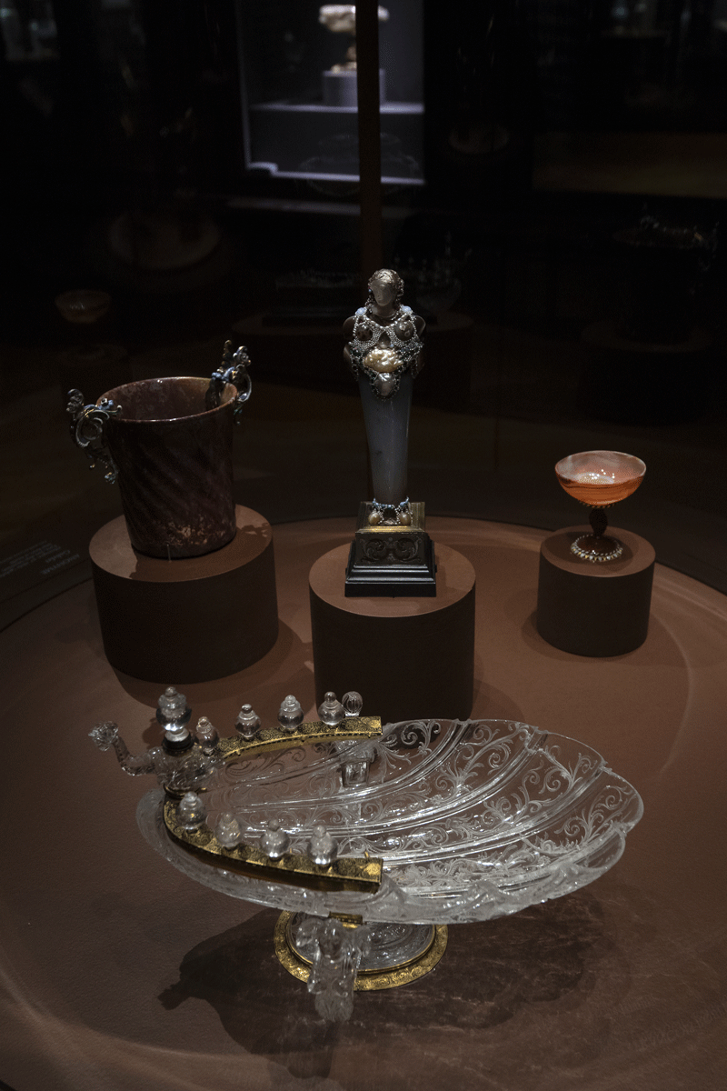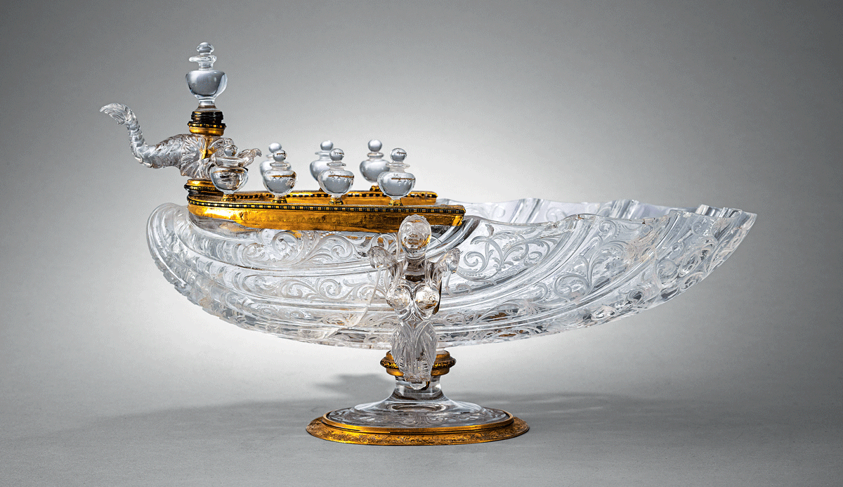 Dans le domaine des cristaux, le prince prisait tant les grandes pièces spectaculaires aux foisonnants décors gravés que celles sans gravure, où resplendissait la parfaite transparence du cristal de roche. Les vases zoomorphes, les galères et autres chariots à roulettes reflètent le goût du prince pour les pièces extraordinaires.