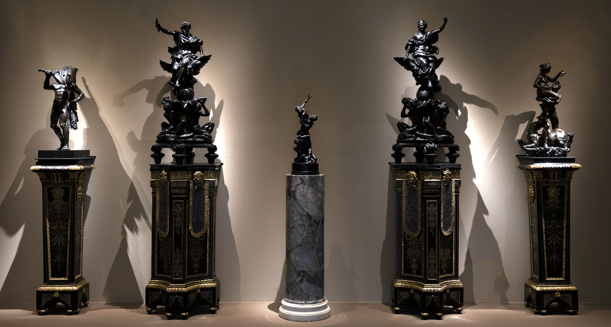 Bronzes des musées du Louvre, de la Wallace Collection et du château de Versailles, présentés sur des gaines et scabellons d’André-Charles Boulle dans l’exposition. © EPV / Didier Saulnier