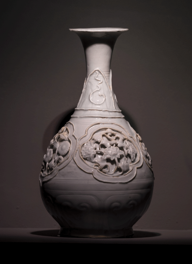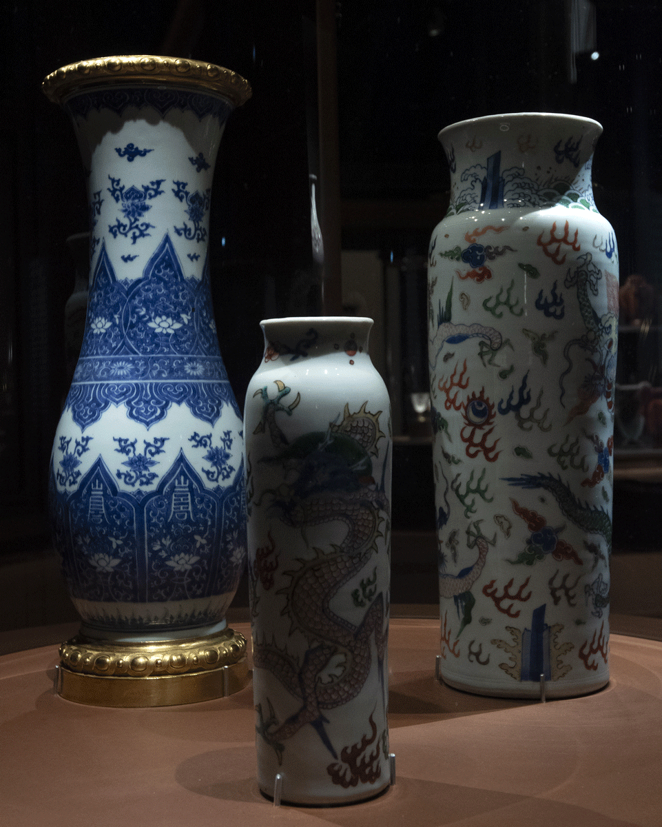 Bouteille et vases « rouleaux » de la dynastie Qing (Chine), présentés dans l’exposition. © EPV / Didier Saulnier