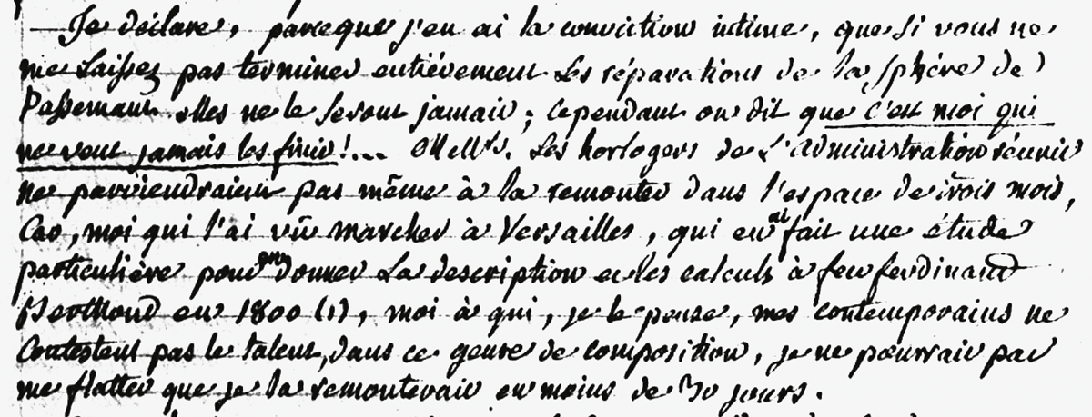 C’est dans ce contexte qu’intervient l’affaire de la disparition des bronzes de la pendule de Passemant. Premier acte : en 1800, le Garde-Meuble confie la pendule à Janvier pour restauration dans le cadre du remeublement des Tuileries. Le projet suspendu, Janvier devient dépositaire de cette « machine en souffrance » qui tombe peu à peu dans l’oubli. Deuxième acte : vingt-deux ans plus tard, un intendant des Bâtiments du roi alerte le Garde-Meuble sur cette disparition étrange. L’enquête est lancée et la pendule est finalement localisée dans l’atelier de Janvier. Le baron de Ville-d’Avray, intendant du Garde-Meuble, ordonne donc l’achèvement rapide de sa restauration. S’engage alors une correspondance invraisemblable où Janvier multiplie les excuses fantasques pour retarder l’échéance : pinaillages sur les comptes, cataracte intense l’ayant empêché d’avancer son travail, mauvaise santé de sa servante qu’il s’est dévoué à sauver avant qu’elle n’expire dans ses bras, restauration perturbée par les vices d’exécution de l’œuvre originale… Face aux sommations répétées de l’Administration, Janvier ment effrontément, et avec panache, assaisonnant parfois ses lettres de citations latines tragiques.