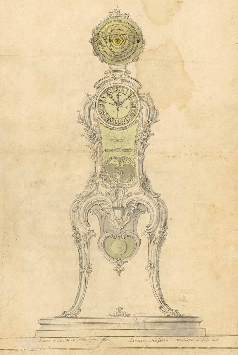 Dessin de la pendule de Passemant par Philippe Caffieri, s. d., Berlin, Staatliche Museen zu Berlin, Kunstbibliothek. Domaine public, via Wikimedia Commons