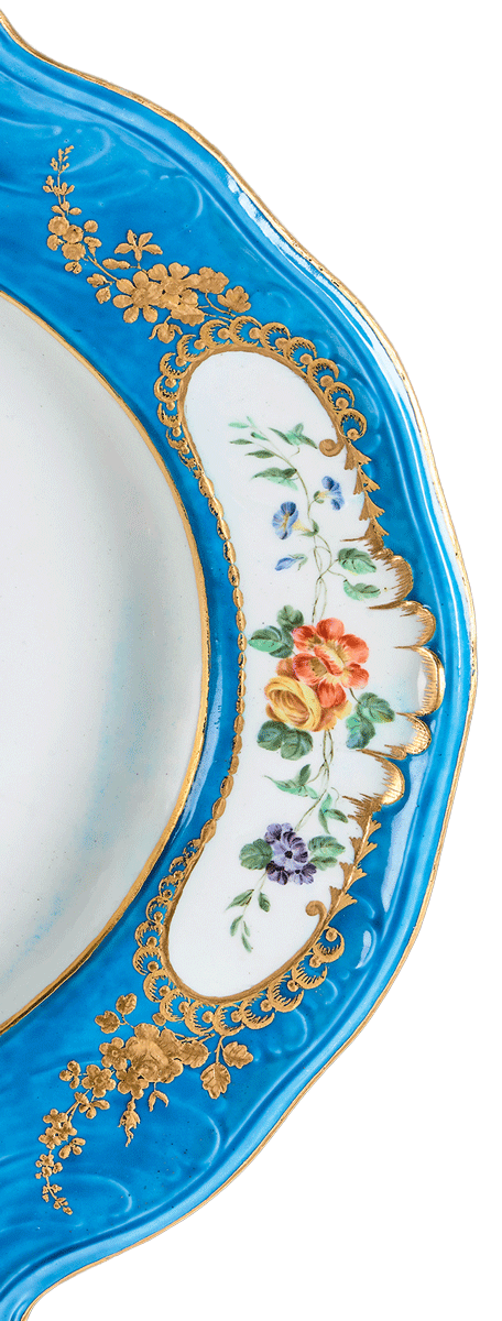 Détail de l’aile du grand plat ovale du service « à fond bleu céleste ».