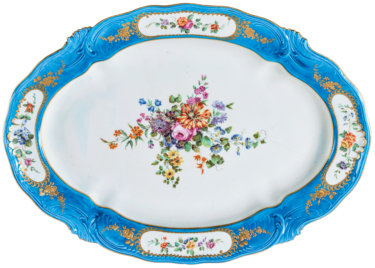 Grand plat ovale du service « à fond bleu céleste » livré à Louis XV, décor par Pierre-Joseph Rosset, manufacture de Vincennes, 1755, porcelaine tendre, H. : 6,5 ; L. : 60,5 ; Pr. : 44,5 cm, musée national des châteaux de Versailles et de Trianon, V.2025.14.