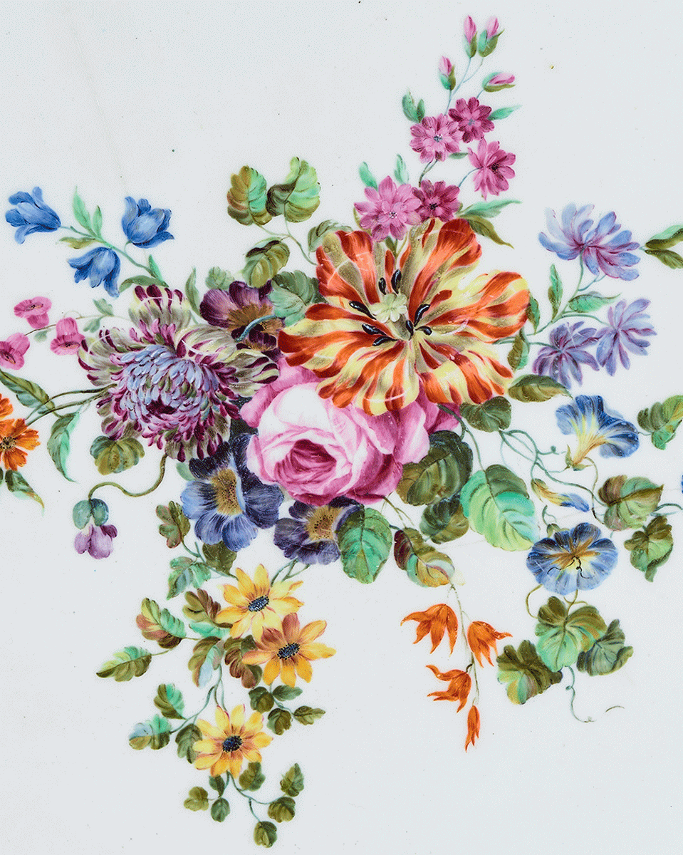Détail du bouquet central du grand plat ovale du service « à fond bleu céleste ».